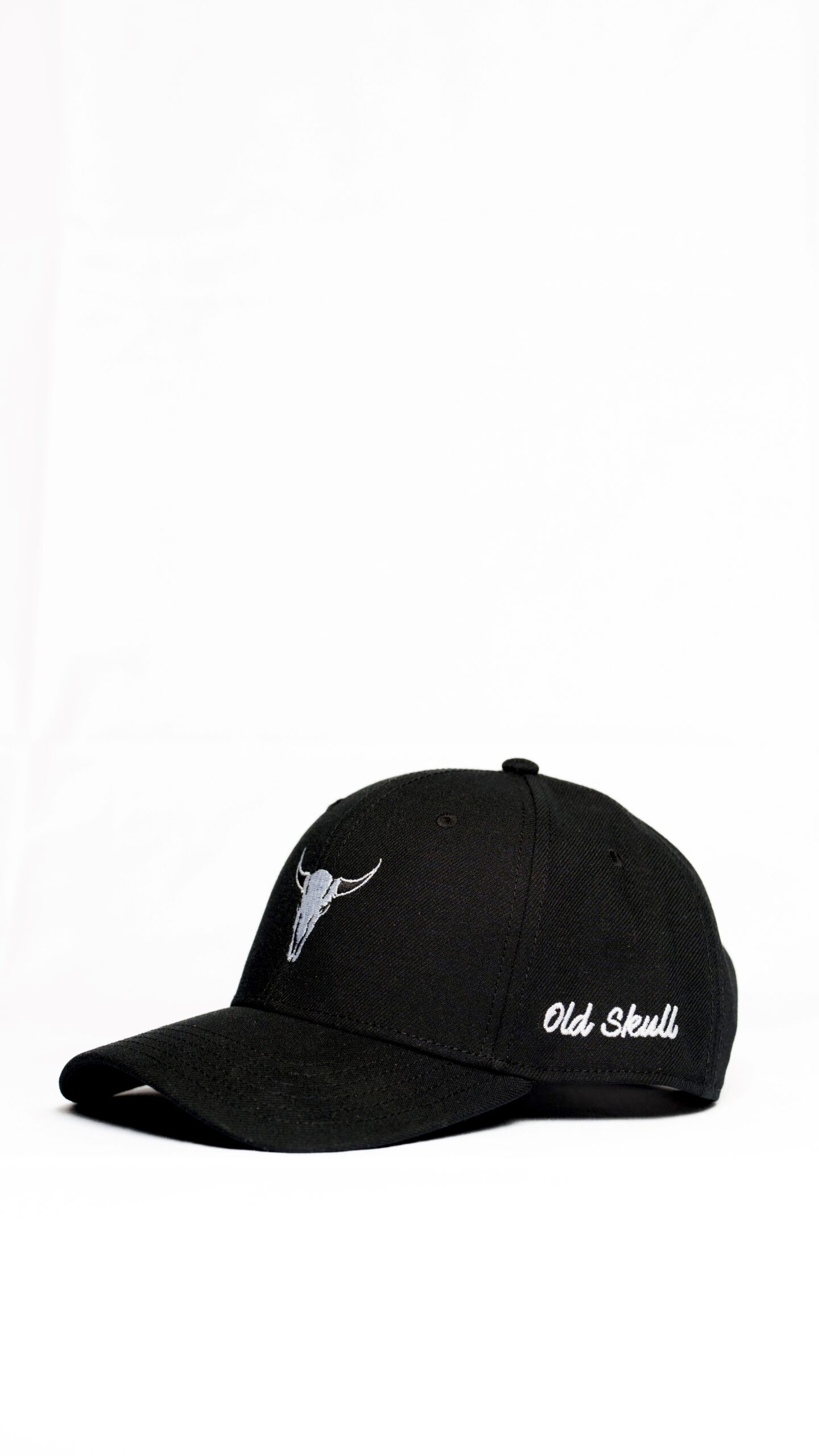Black baseball cap with white embroidered logo front & left. Adjustable plastic snapback closure.