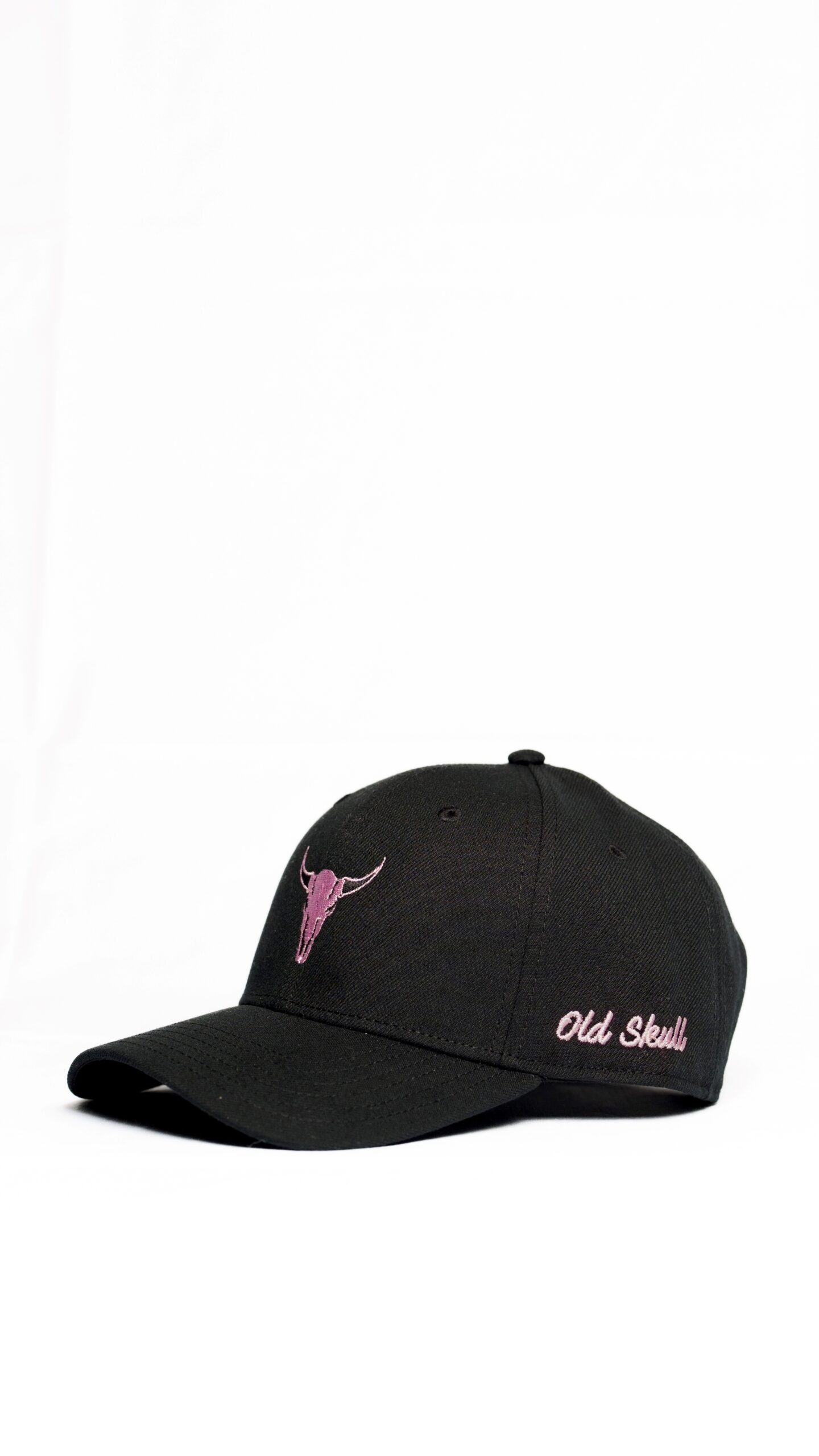 Black baseball cap with pink embroidered logo front & left. Adjustable plastic snapback closure.
