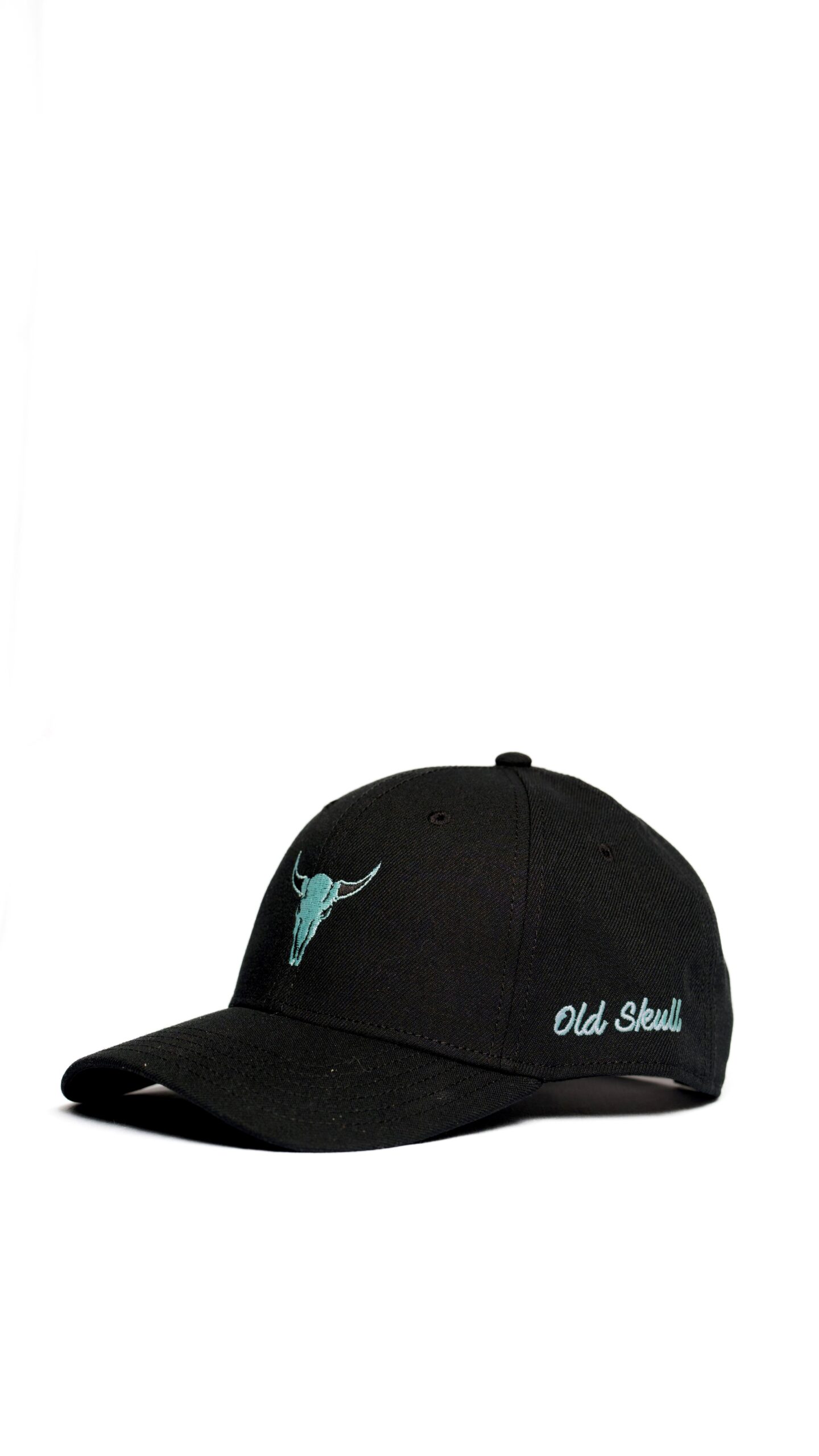 Black cap with light blue embroidered logo front & left. Adjustable plastic snapback closure.