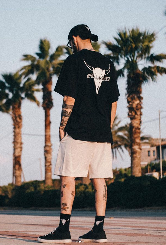 Old skull beige shorts with a white logo on the frontside